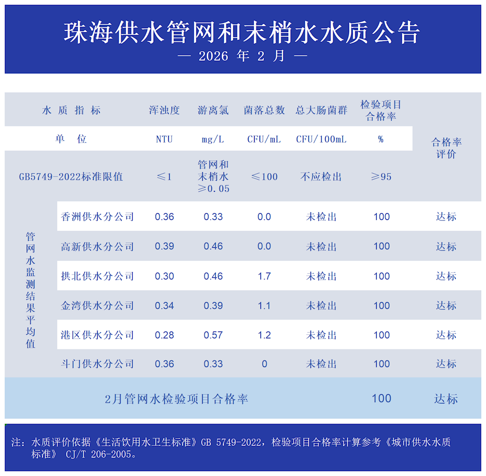 2026年2月珠海供水管網和末梢水水質公告