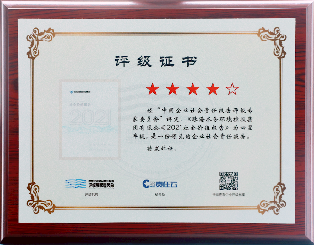 經過十年錘煉,珠海水控集團作為粵港澳大灣區水務環保行業的大型國有企業,在擔當國企社會責任,踐行國企社會價值領域堅持不懈地努力,獲得了更多的社會認可?!爸袊髽I社會責任報告評級專家委員會”根據中國社科院《中國企業社會責任報告指南(CASS-CSR4.0)》《中國企業社會責任報告評級標準2020》權威依據,經過嚴格的評審過程,對《珠海水控集團2021年度社會價值報告》做出四星半級的評級結果,認為“是一份領先的企業社會責任報告”。