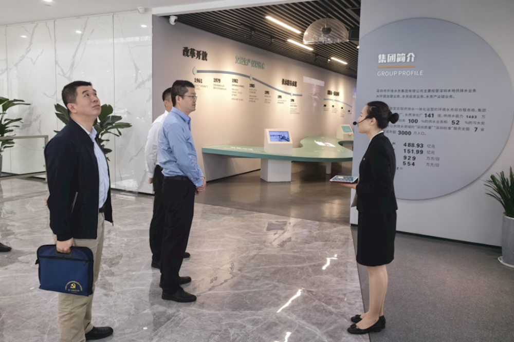 王子程一行首先參觀了深圳環境水務集團總部一樓的會議展廳,在參觀過程中,充分了解了深圳環境水務集團的發展歷程,也了解了深圳環境水務集團的主要供排水管網的業務分布、架構,也深入學習了其“走出去”的優秀案例。