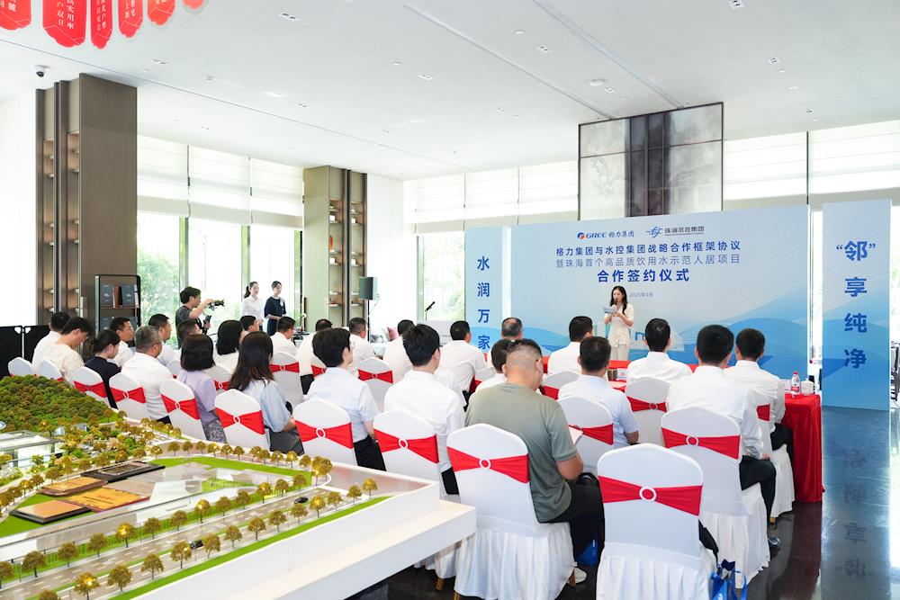 當天,項目合作雙方——珠海格力集團有限公司與珠海水務環境控股集團有限公司簽署戰略合作框架協議,合作圍繞項目資源合作、供排水保障服務、工程領域及水務科技合作創新等維度展開,雙方將對接海島水資源利用方案、推進高品質飲用水入戶,水控集團還將為格力集團項目提供“全鏈條”水務支持,并以新規高品質人居項目為試點,推進市政直飲水入戶,探索水務科技應用。簽約儀式上,雙方共同啟動珠海首個高品質飲用水示范人居項目。此次合作既是國有企業跨領域協同服務民生的創新實踐,也為珠海構建更安全、更健康的城市供水網絡按下“加速鍵”。
