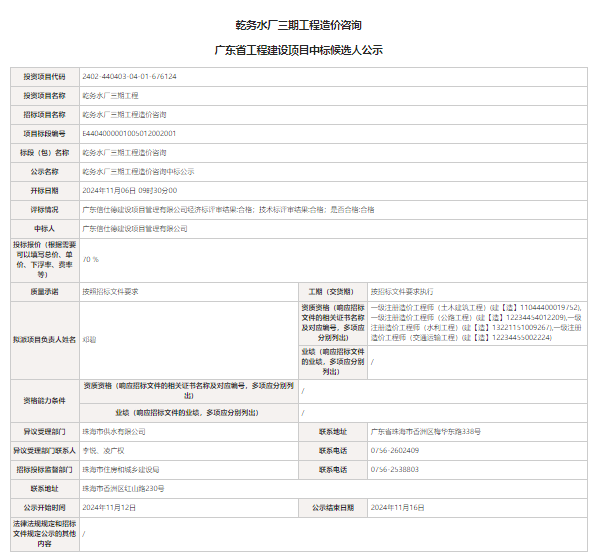 乾務水廠三期工程造價咨詢中標公示