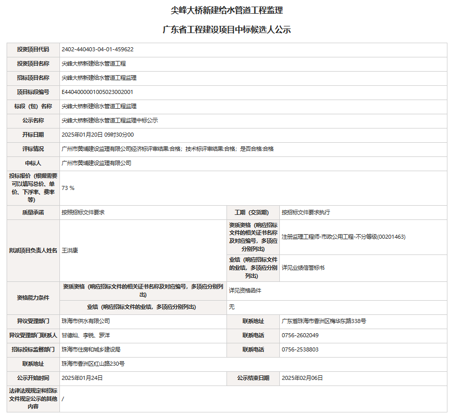 尖峰大橋新建給水管道工程監理中標候選人公示